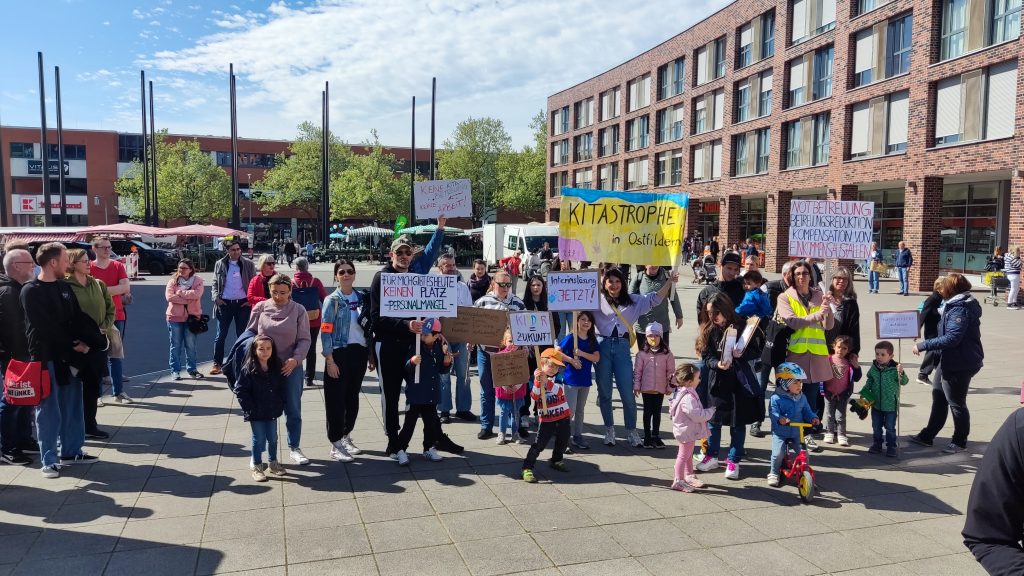 Im Anschluss daran folgte eine Kundgebung, bei der verschiedene Forderungen an die Stadtverwaltung und den Träger der Kitas präsentiert wurden. Zu den Hauptanliegen gehörten eine Verbesserung bei der Personalsuche und -haltung, die Verbesserung der Arbeitsbedingungen für das pädagogische Personal, eine finanzielle Entlastung der Eltern, die Rückkehr zur Ganztagesbetreuung sowie die Schaffung neuer Betreuungsplätze.