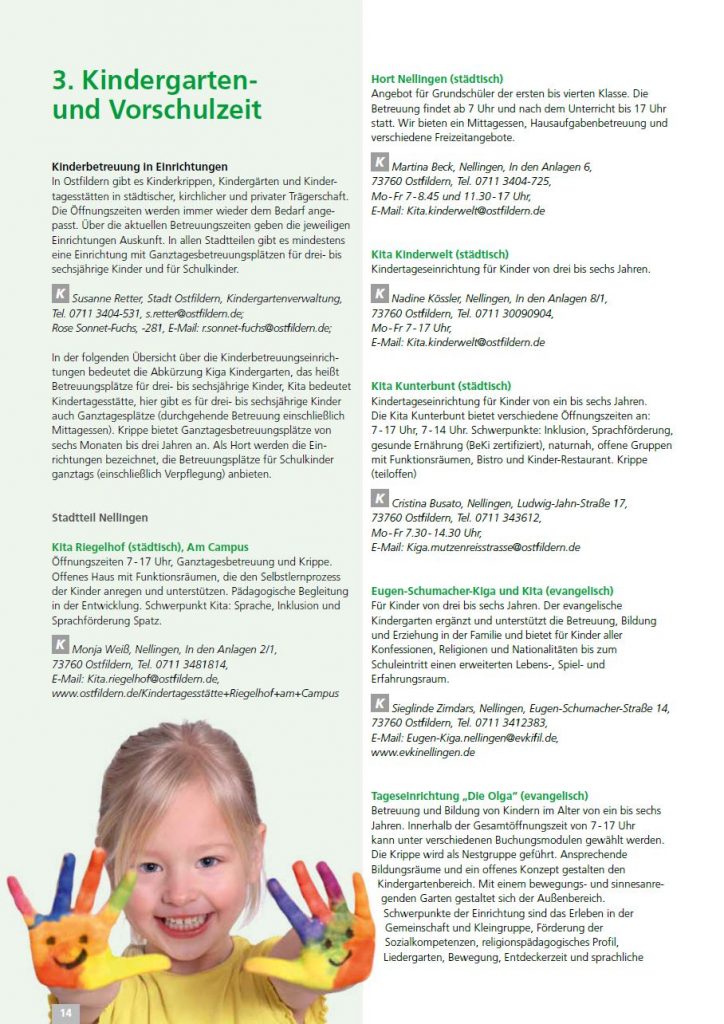 In der Broschüre “Leben in Ostfildern” wird ein Überblick über die Kinderbetreuung in den Einrichtungen gegeben.